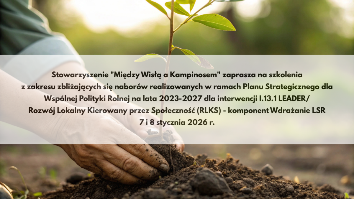 Stowarzyszenie „Między Wisłą a Kampinosem” zaprasza na szkolenia z zakresu zbliżających się naborów realizowanych w ramach Planu Strategicznego dla Wspólnej Polityki Rolnej na lata 2023-2027 dla interwencji I.13.1 LEADER/Rozwój Lokalny Kierowany przez Społeczność (RLKS) – komponent Wdrażanie LSR.