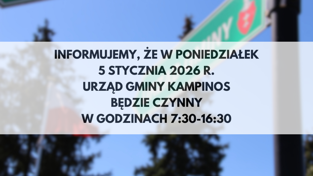 Informujemy, że w poniedziałek 5 stycznia 2026 r. Urząd Gminy Kampinos będzie czynny w godzinach 7:30-16:30. Prosimy o zaplanowanie wizyty w urzędzie z uwzględnieniem podanych godzin. Dziękujemy za wyrozumiałość.