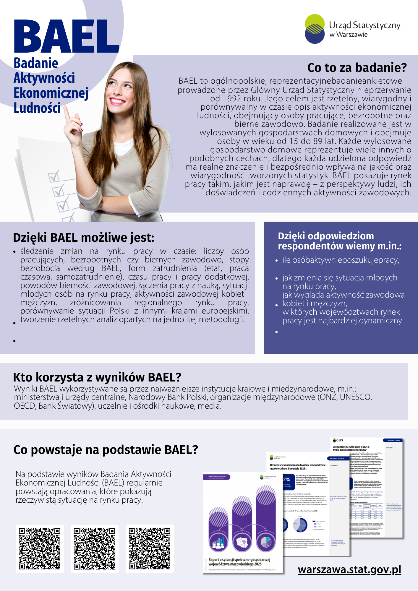 Urząd Statystyczny w Warszawie informuje na temat prowadzonego przez statystykę publiczną Badania Aktywności Ekonomicznej Ludności (BAEL). Jest to jedno z głównych badań ankietowych przeprowadzanych przez urzędy statystyczne i jedno z trzech badań obywateli Polski, które są prowadzone przez cały rok. W badaniu uczestniczą mieszkańcy Polski w wieku 15 lat i więcej, którzy zamieszkują wylosowane gospodarstwa domowe.
