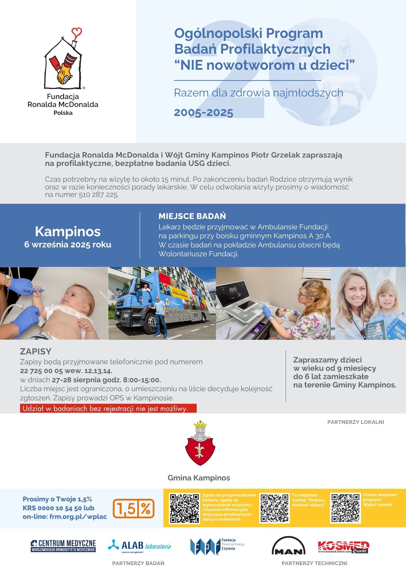 Fundacja Ronalda McDonalda oraz Wójt Gminy Kampinos zapraszają na profilaktyczne, bezpłatne badania USG dzieci.