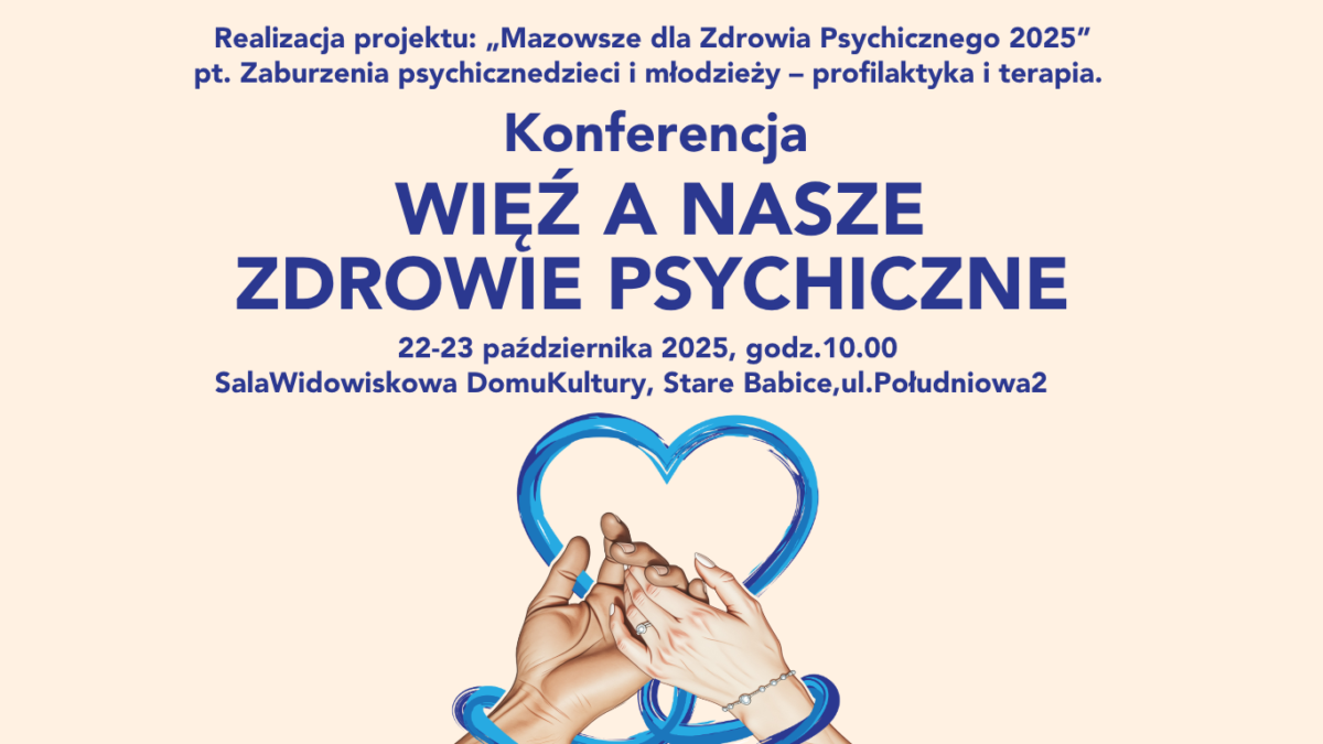 Zespół Poradni Psychologiczno-Pedagogicznych Powiatu Warszawskiego Zachodniego im. Ireny Sendlerowej w Błoniu, w ramach realizacji projektu MAZOWSZE DLA ZDROWIA PSYCHICZNEGO 2025, serdecznie zaprasza rodziców, nauczycieli oraz wszystkich zainteresowanych tematem zdrowia psychicznego i relacji międzyludzkich na konferencję „Więź a nasze zdrowie psychiczne”.
