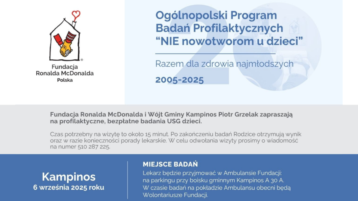 Fundacja Ronalda McDonalda oraz Wójt Gminy Kampinos zapraszają na profilaktyczne, bezpłatne badania USG dzieci.