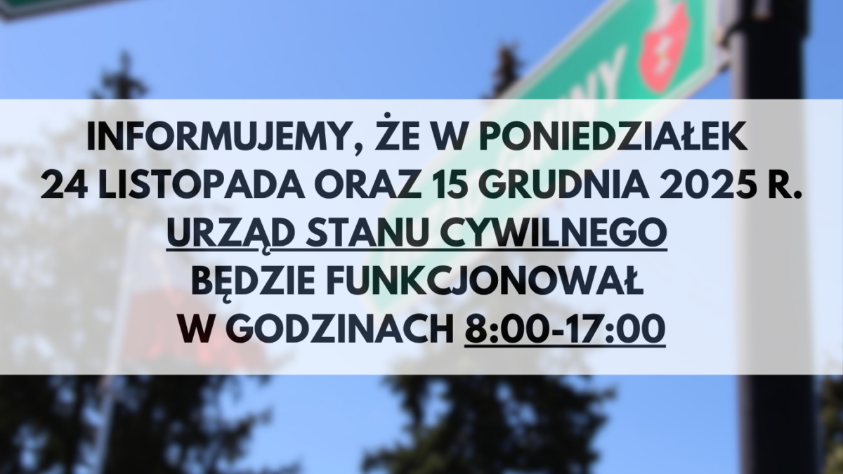 Informujemy, że w poniedziałek 24 listopada oraz 15 grudnia br. Urząd Stanu Cywilnego będzie funkcjonował w godzinach 8:00-17:00.