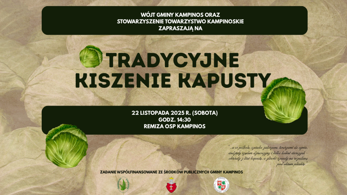 Serdecznie zapraszamy wszystkich mieszkańców na pokaz i warsztaty tradycyjnego kiszenia kapusty, organizowane przez Stowarzyszenie Towarzystwo Kampinoskie: